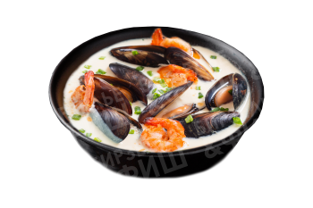 Мидии в створках, креветка тигровая, кальмар, лосось, сливки, лук порей.