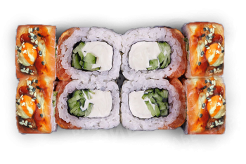 Рис, нори, огурец, спайси соус, сыр сливочный, лосось, унаги соус, кунжут.